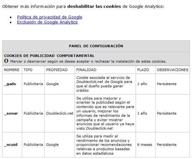 COOKIES UTILIZADAS EN ESTE SITIO WEB